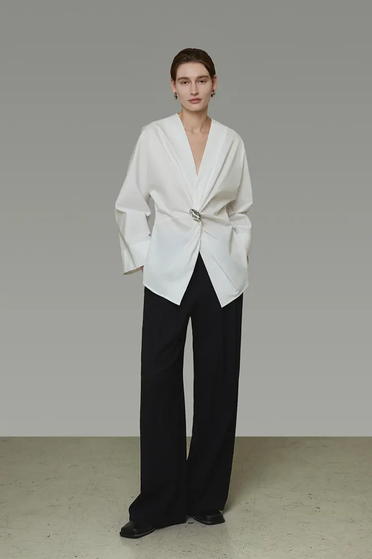 De Women's Metal Buckle Party Blouse heeft een asymmetrische tailleknoop gecombineerd met driedimensionale metalen knopen ter decoratie. De visuele focus is prominent aanwezig, waardoor de taille op natuurlijke wijze wordt geaccentueerd en de rondingen worden benadrukt. Het maakt ook gebruik van plooien om het figuur te verzachten en biedt een hoge mate van flexibiliteit voor verschillende lichaamstypes. De gekruiste V-hals is netjes en elegant, met een frisse, gladde stof die licht van gewicht is en niet inzakt. Het combineert de functionaliteit van een overhemd voor dagelijks gebruik met de modieuze uitstraling van een feesttop, waardoor veelzijdige slijtage en sterke visuele herkenning mogelijk zijn.